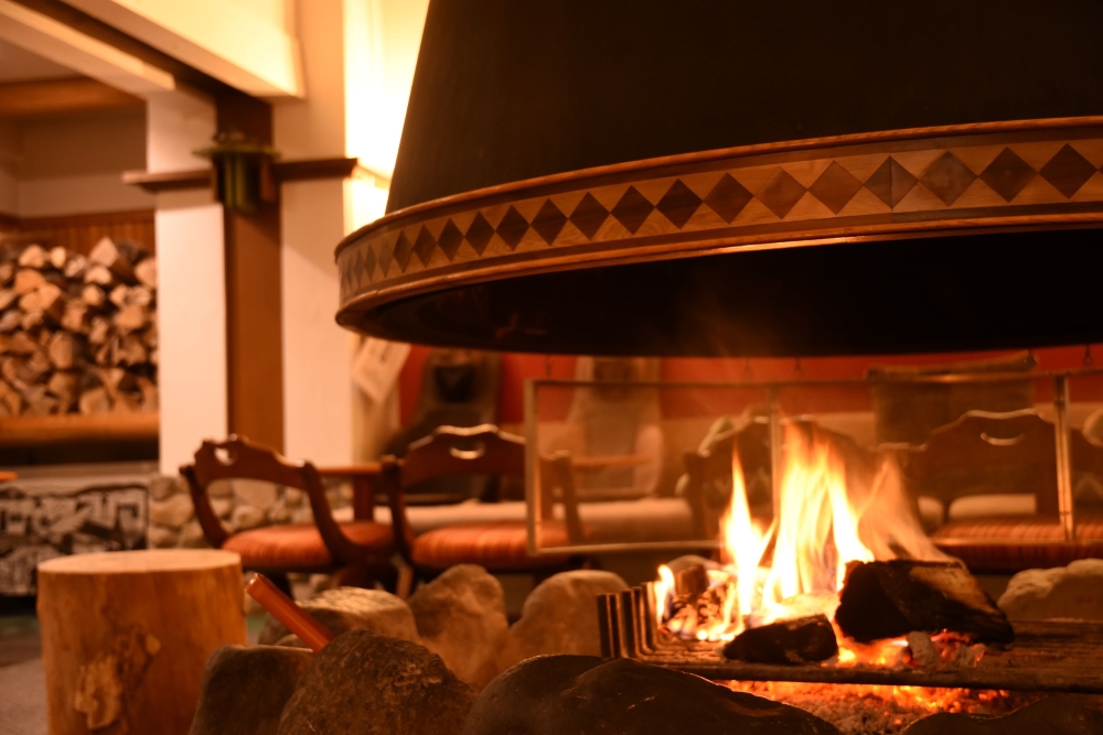 大きな暖炉のあるラウンジです。食事の後のひとときや、朝のコーヒー1杯などにご利用ください。冬の夜は暖炉に火がともります。本棚には本や写真集があります。ご自由にご覧下さい。