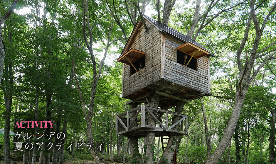 ツリーハウス、スラックライン、ハンモック、フットゴルフやディスクゴルフ、渓流釣りやバーベキューなどが楽しめます。