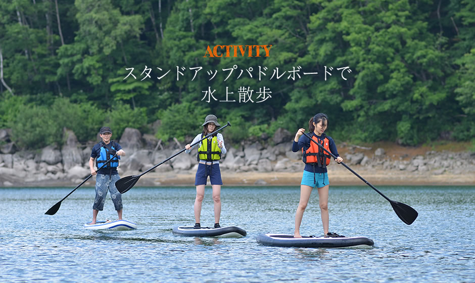 タキモトからお車で約8分の志賀高原で2番目に大きい「琵琶池」ではスタンドアップパドルボード(略してSUP/サップ)ができます。