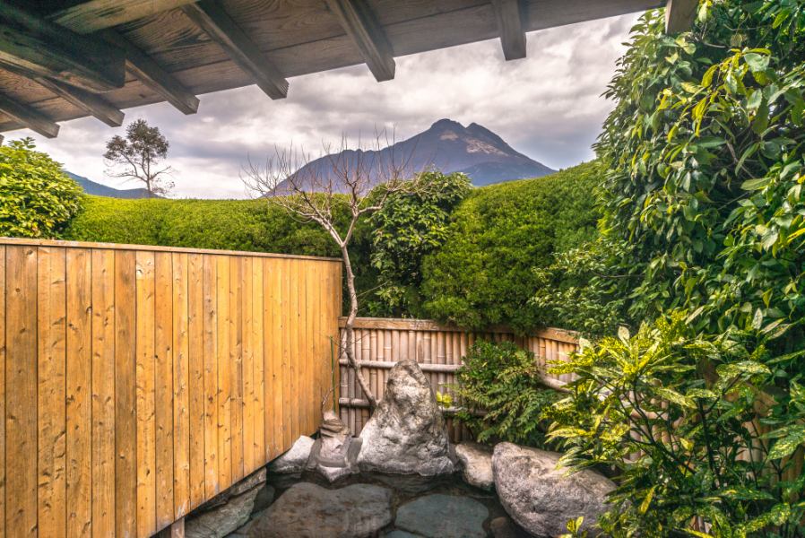 雄大な由布岳が目の前にあり、極楽気分になれるお風呂です。
