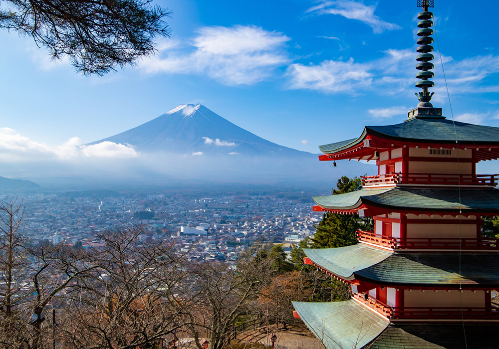 新倉山の中腹に位置する「新倉山浅間公園」は、富士山を正面に望めるスポット。