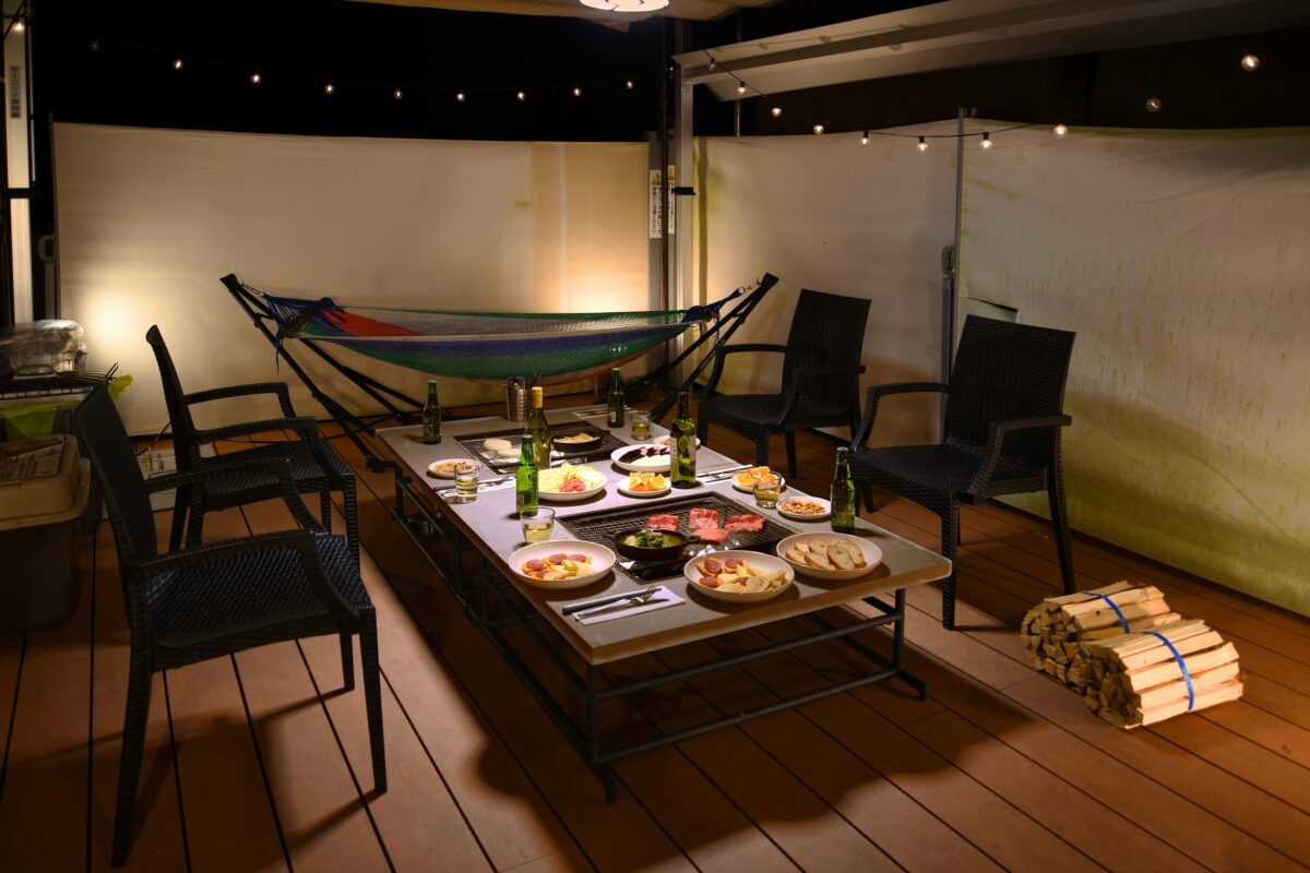 ウッドデッキに設置してあるBBQ機材をチェックして、配置してください。