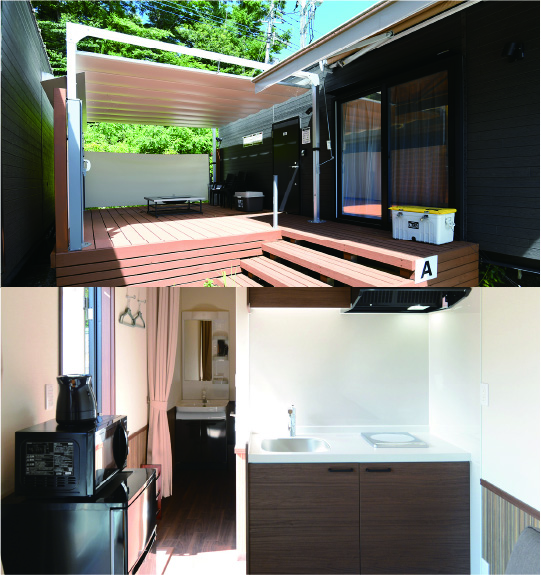 ミニキッチン、エアコン、冷蔵庫、電子レンジ、炊飯器(5合炊き)、トースター、ケトル、テレビ、バスタブ付き浴室、洗面台、温水洗浄トイレ、ソファ、加湿機能付き空気清浄機、踏み台、wi-fi、BBQテーブルセット、オーニングテント