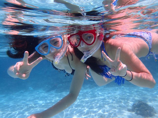 初めての海遊びでシュノーケル(スノーケル)をして、水面からカラフルなお魚屋や水中生物を観察した後は、ランチを挟んで体験ダイビング!