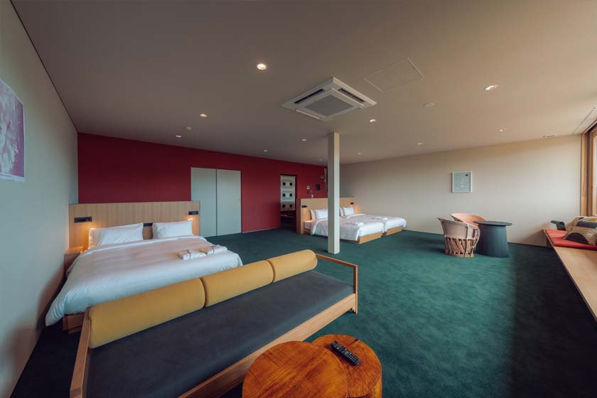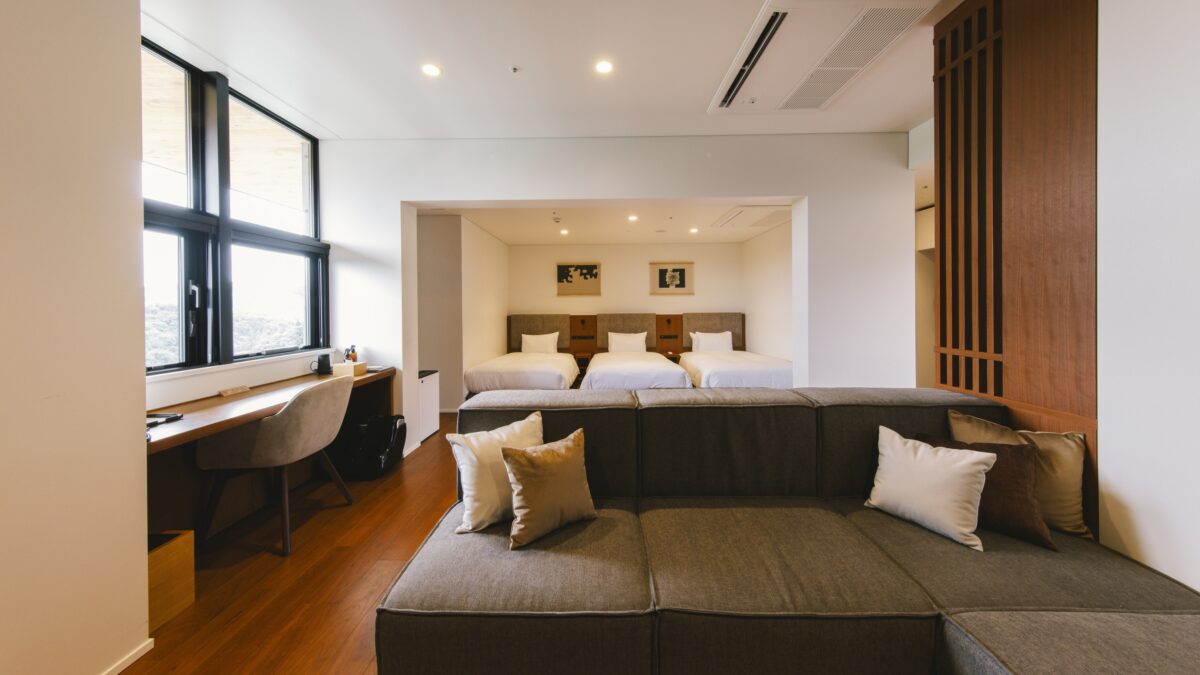 ベッドを3台設置し、ロングソファ、55インチの大型テレビを配置。