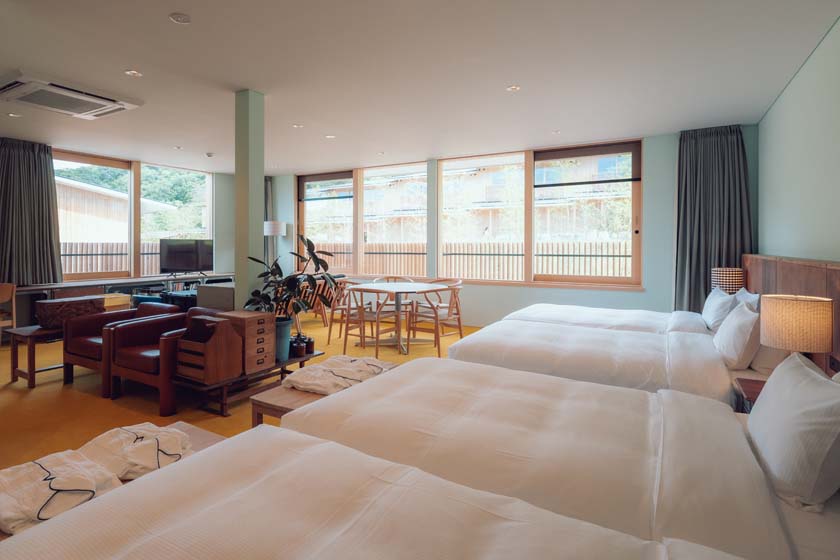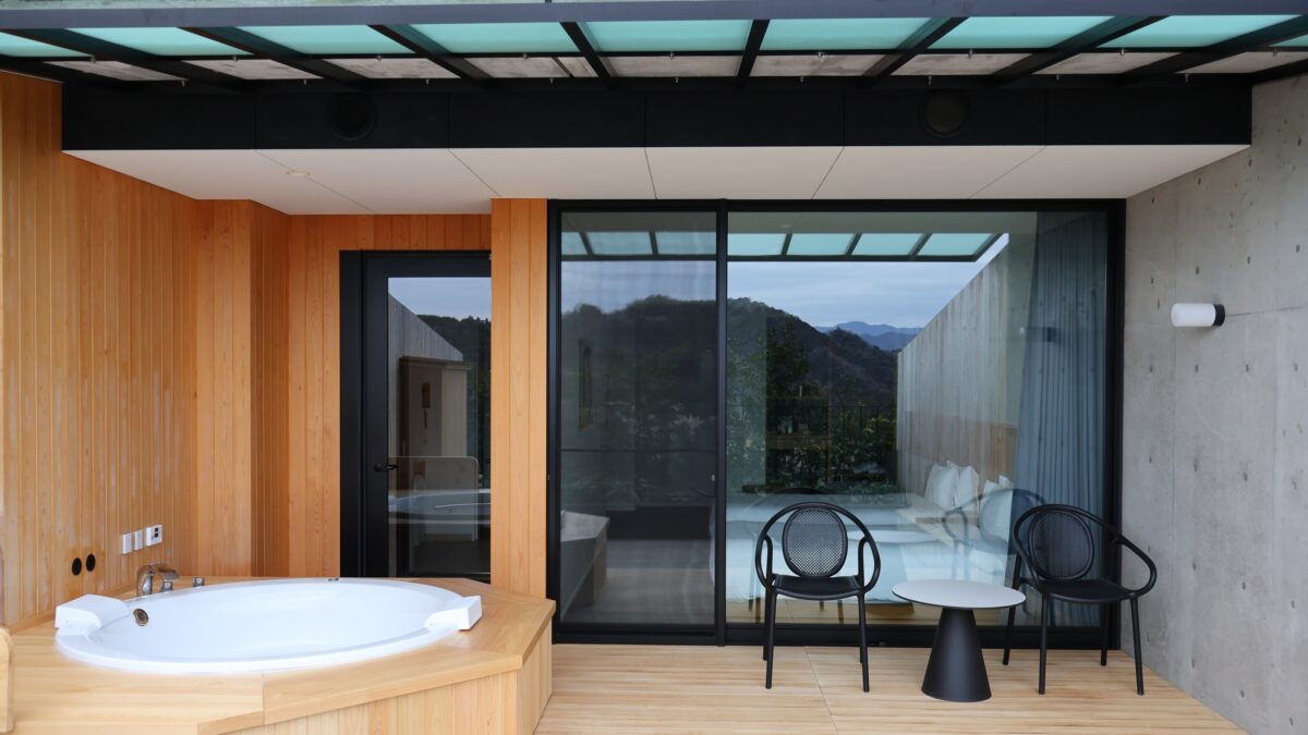 ホテルの客室最上階に位置し、多気の大自然を一望できる大きなテラスに露天風呂を備えた72㎡の大きな客室で、高音質スピーカー、フットマッサージ機を設置しています。