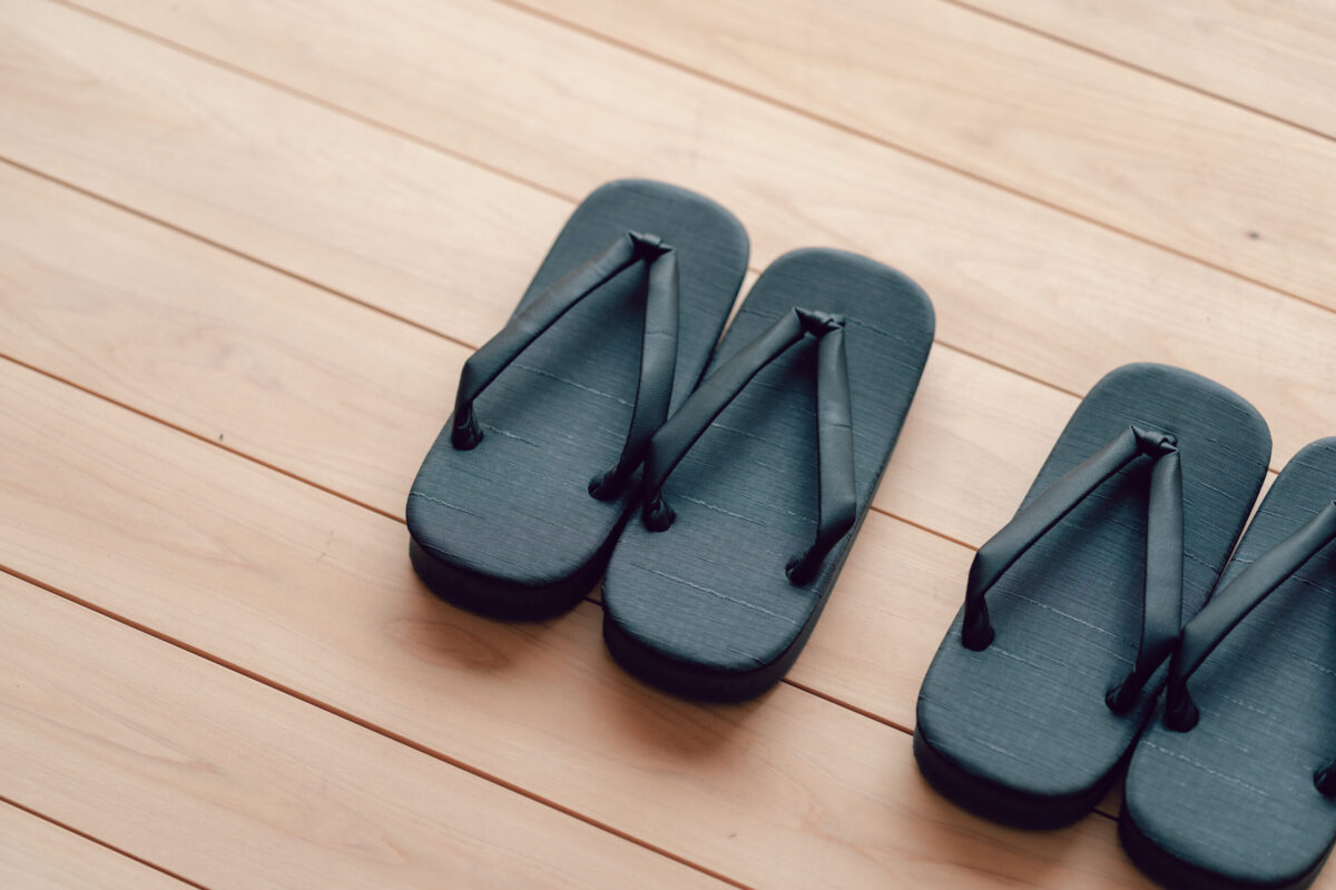 客室内でご利用いただく室内着とスリッパ、VISON施設内でもご利用いただける館外着と雪駄を設置しています。