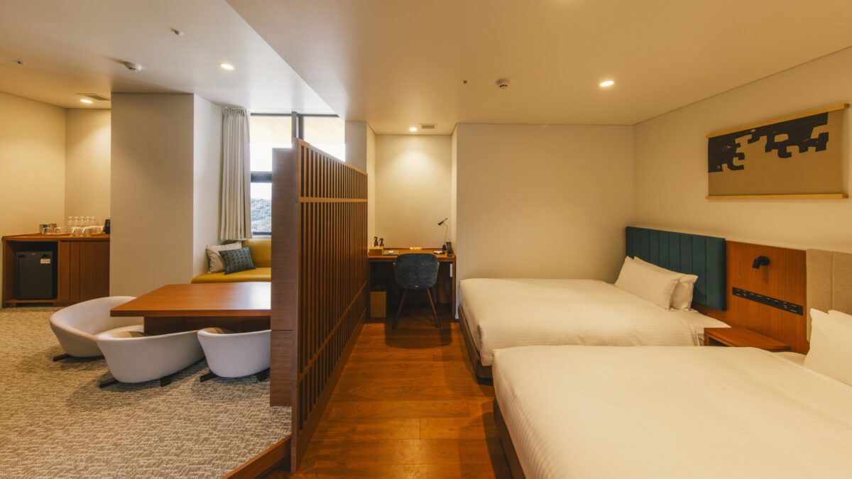 当ホテル初の2段ベッドを導入し、靴を脱いでお過ごしいただける小上がりを設置。お部屋に入った瞬間のわくわく感を演出しました。