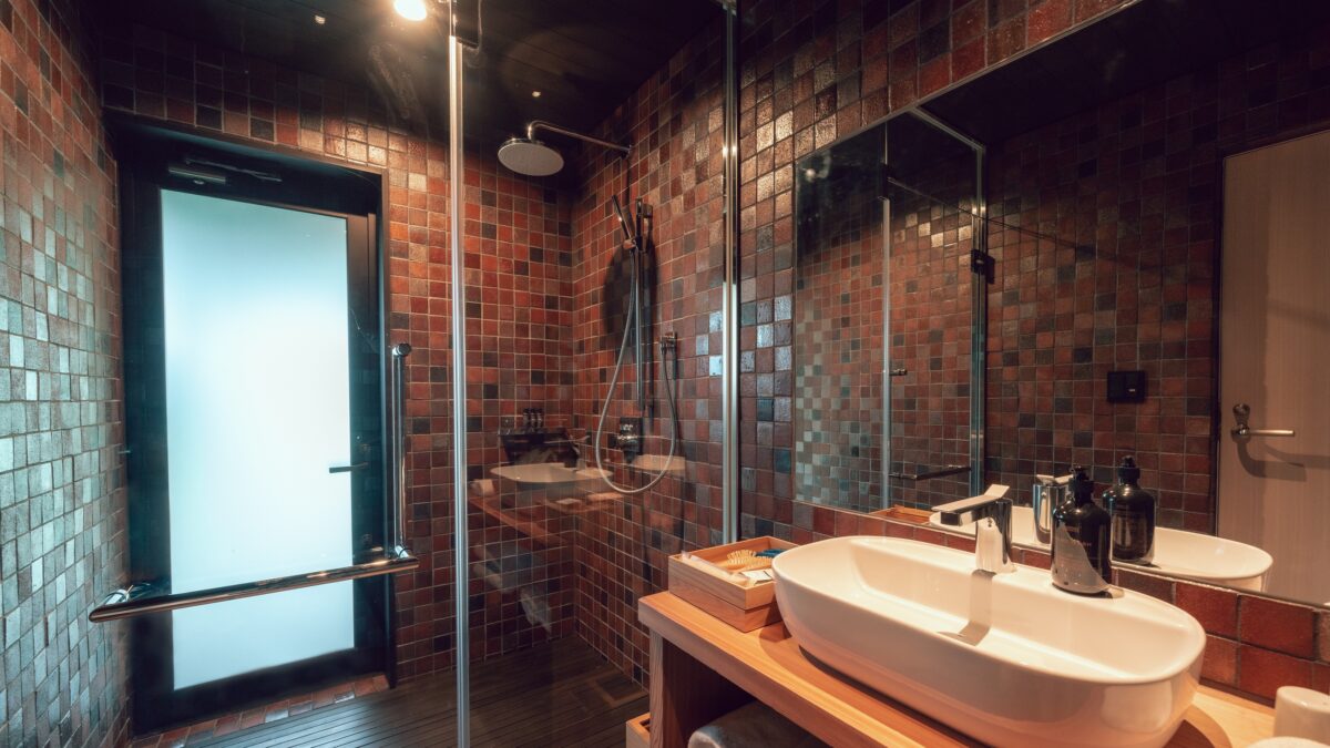 客室には屋外バス・屋内シャワーブース・トイレ・洗面台の3点独立タイプとなっており浴室の窓は開放可能。