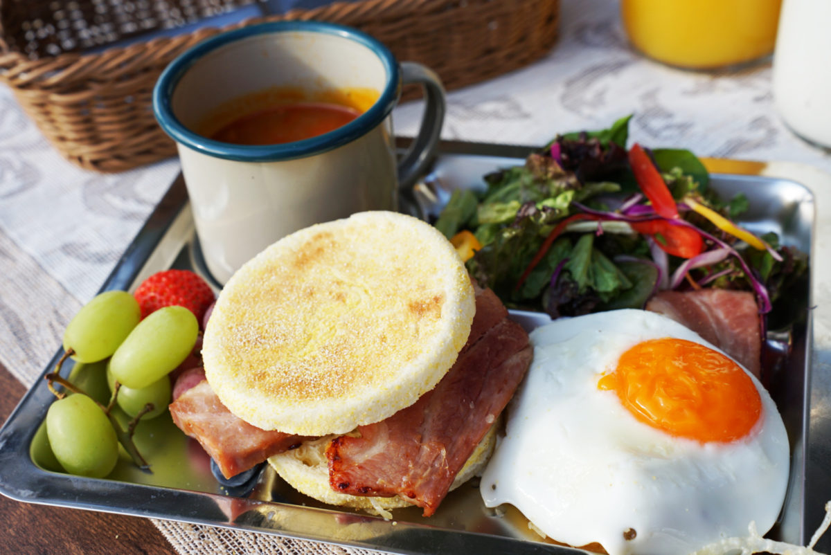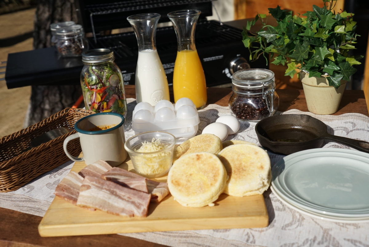 朝食はグリルを使用し、風を体に受けてアツアツマフィンサンドを頬張る。