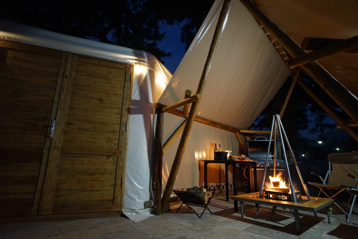 快適な空間で楽しむグランピングに加え、夜を彩る焚火は各サイト専用の焚火があるのでキャンプ体験も味わえる!