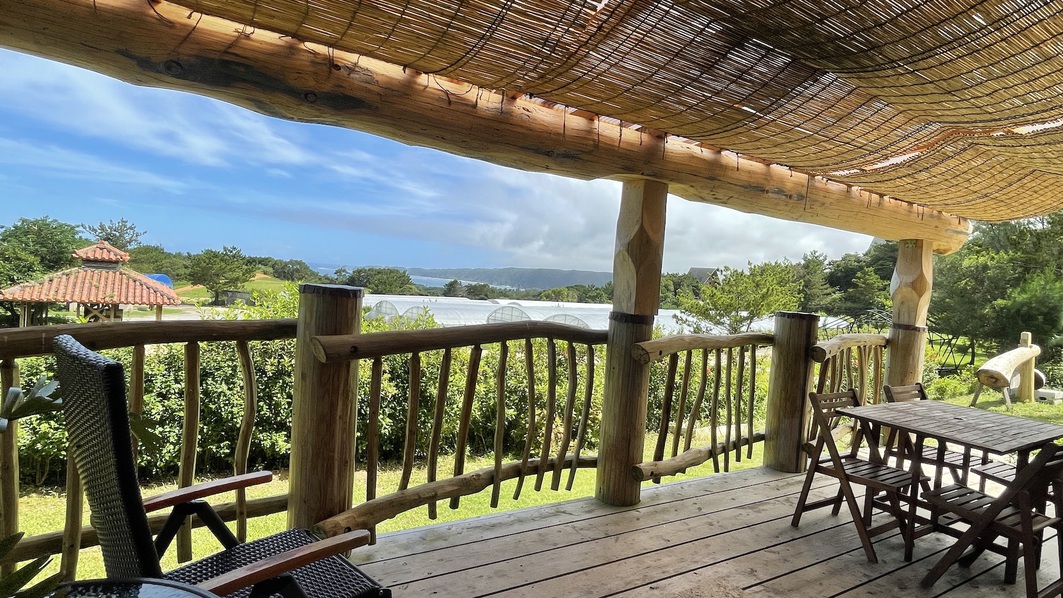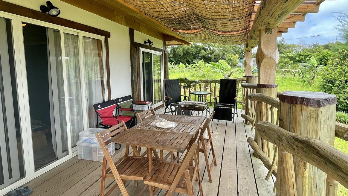 オーシャンビューの​屋根付きデッキでBBQ!敷地内で焚き火や花火をしたり、季節によっては蛍が姿を現すことも。