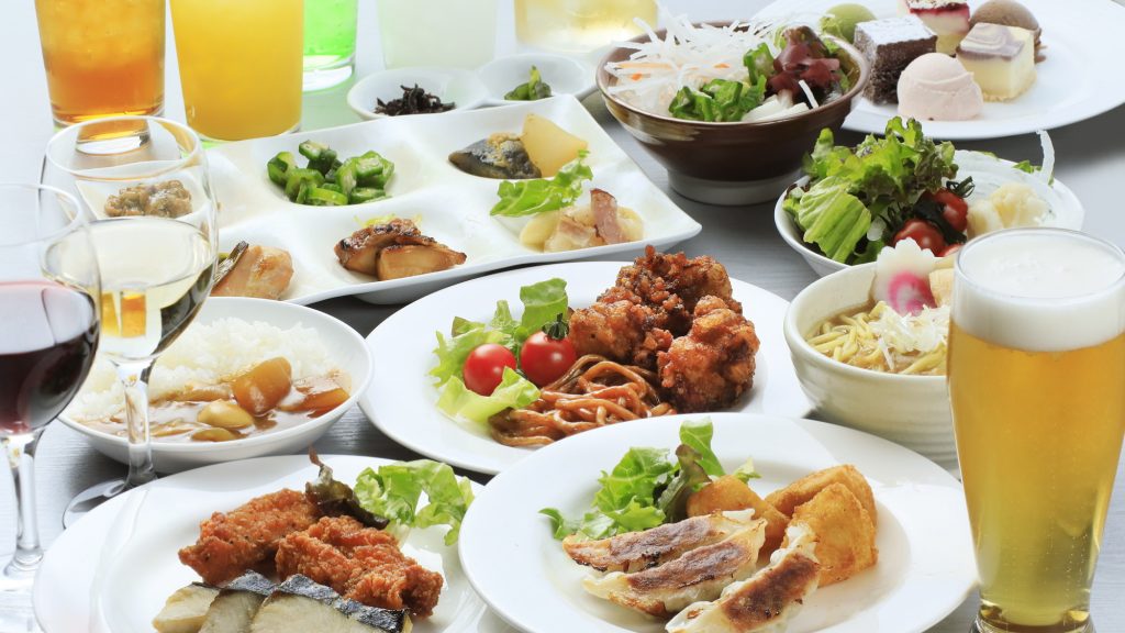 料理長渾身の選べる逸品料理に加え、地産地消のメニューや、ライブキッチンの揚げたて天ぷらが楽しめるバイキングをお楽しみください。