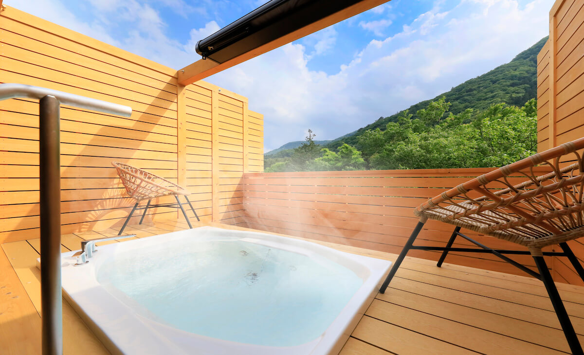 当館最上階には、雄大な山ビューをご覧いただける灯(tou)・里(sato)・川(kawa)・滝(taki)の4つの貸切露天風呂をご用意。
