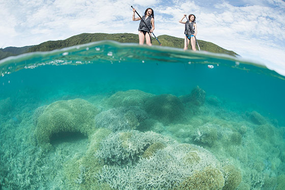 カヤックやSUPと一緒にシュノーケリングセットを借りて、水面からの景色も水中の景色も楽しむことができます。泳ぐのが苦手な方は、ウェットスーツをレンタルすることで楽に浮いてサンゴや魚を観察することもできますよ。
