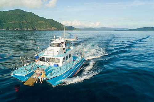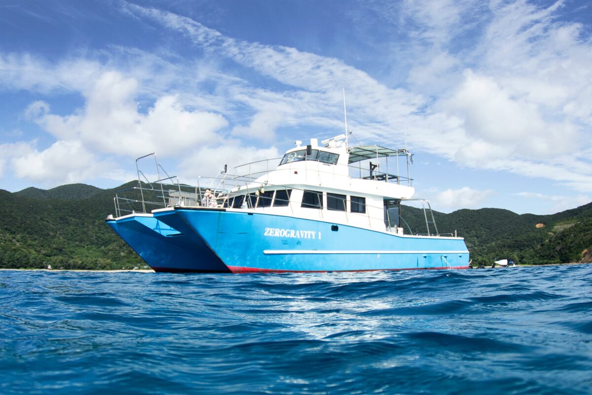 カタマラン船「ゼログラヴィティI号」取り外し式のスロープで車いすのまま乗船することが可能。カタマランタイプは横揺れも少なく、船内にはバリアフリーの温水シャワー&ウォシュレットトイレやテレビ、冷蔵庫、エアコン完備のリビングルームなどが設置されているので快適に過ごせます。ダイビングやスノーケリング、ホエールウォッチ、クルージングなどのアクティビティがこちらの船に乗ってお楽しみいただけます。