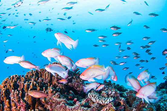 4月~7月は奄美大島固有種のアマミホシゾラフグが作る「ミステリーサークル」が見られ、5月~6月はサンゴの産卵が観察できます。また、日本有数のクロマグロ養殖場の近くに集まる大きなコバンザメの群れなど、国内外のメディアで放送された話題のダイビングスポットは必見です。
