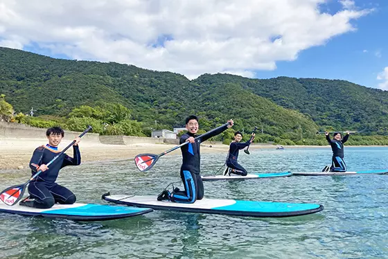 サップをレンタルして清水海岸へ!立って漕ぎ進むだけでなく、膝立ちで座って水の上の散歩を楽しんだり、仰向けに寝て空を眺めながらぼーっとしたり、シュノーケリングセットで顔をつけて海の中を覗いてみたり、自由に楽しみましょう。