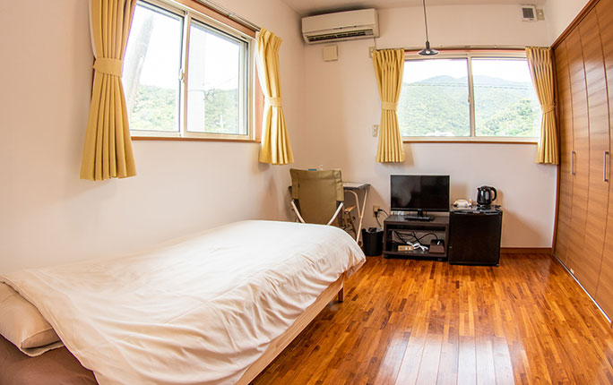 2階のお部屋は、トイレ、お風呂が共有となります。クローゼットや作業デスクも完備、長期のご滞在にも快適です。コロナ対策で壁紙・ドアノブを抗菌仕様にしました。シングルルームはベッドアレンジで2台(ツイン、ハリウッドツイン)にも対応可能です。