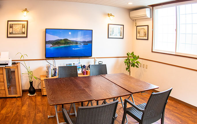 くつろぎ空間では、ご自由にお時間をお過ごしください。利用方法としては、お食事・大型テレビでテレビ観覧や旅の思い出のデータをみんなで見る・ティータイムなどなど自由です。無料で豆から挽くコーヒー・お茶・紅茶などのドリンクや、電子レンジ、ポットなどご利用頂けます。(※有料ドリンクコーナーあり)コロナ対策で壁紙を抗菌仕様にしました。