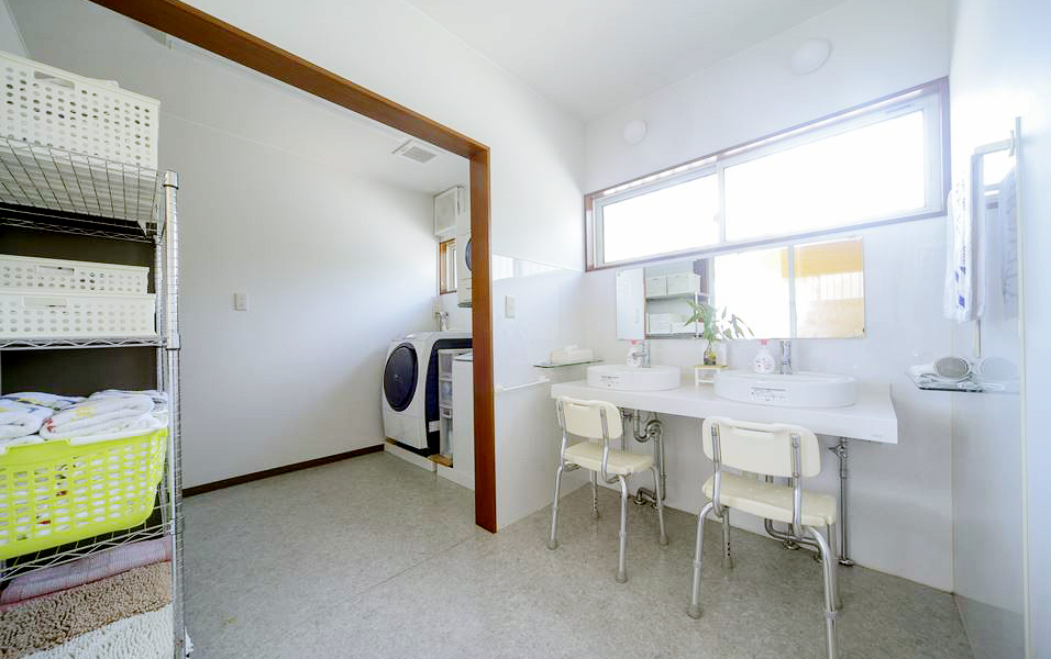 メイクアップ洗面台、ドライヤー・洗濯機・乾燥機・洗剤などが無料でご利用頂けます。コロナ対策で非接触の全自動水栓に変更しました。(1階・バリアフリー対応)